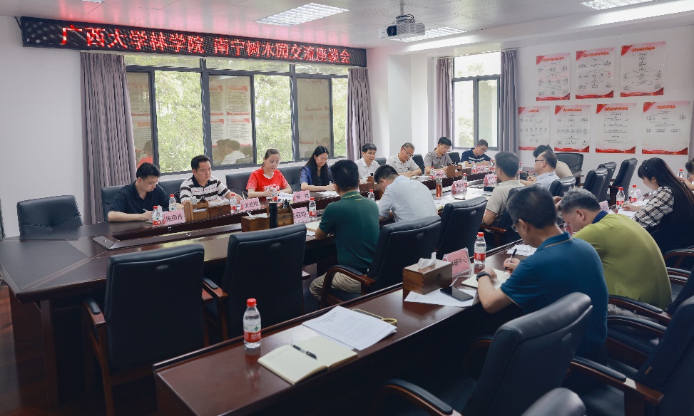 黄里云一行与南宁树木园党委副书记、主任余注光等负责人召开座谈会,主要围绕人才培养、科学研究与技术创新、产学研合作、平台建设和党建联建等内容开展深入的研讨。双方就如何建设广西现代林业产业学院,实现校企的高效对接和培养具备创新精神和实践能力的高素质林业产业人才,推动林业产业科学研究、技术创新和产学研合作等内容交换了建议和意见。黄里云代表学院感谢南宁树木园对学院的大力支持,她希望双方通过党建联建、科教产教的双促双融,进一步加强合作,建立联合攻关机制、促进人才培养和现代林业产业学院的建设。