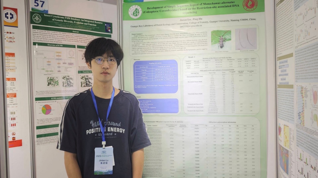 国际昆虫学大会是由国际昆虫学会理事会(CICE)指导的全球性学术活动,是昆虫科学领域最高级别的学术盛会之一。威廉希尔官网24级生态学博士研究生鲁进韬受邀参加此次会议,并在会场以“Development of Simple Sequence Repeat ofMonochamusalternatus(Coleoptera:Cerambycidae) Based on Restriction Site-Associated DNA Sequencing”为题作了墙报展示。该研究聚焦林业重大害虫松墨天牛,开发了16个具有多态性高、稳定性强特点的SSR位点,为进一步开展松墨天牛的谱系地理学研究、建立遗传图谱以及深入探索基因功能提供了重要工具。