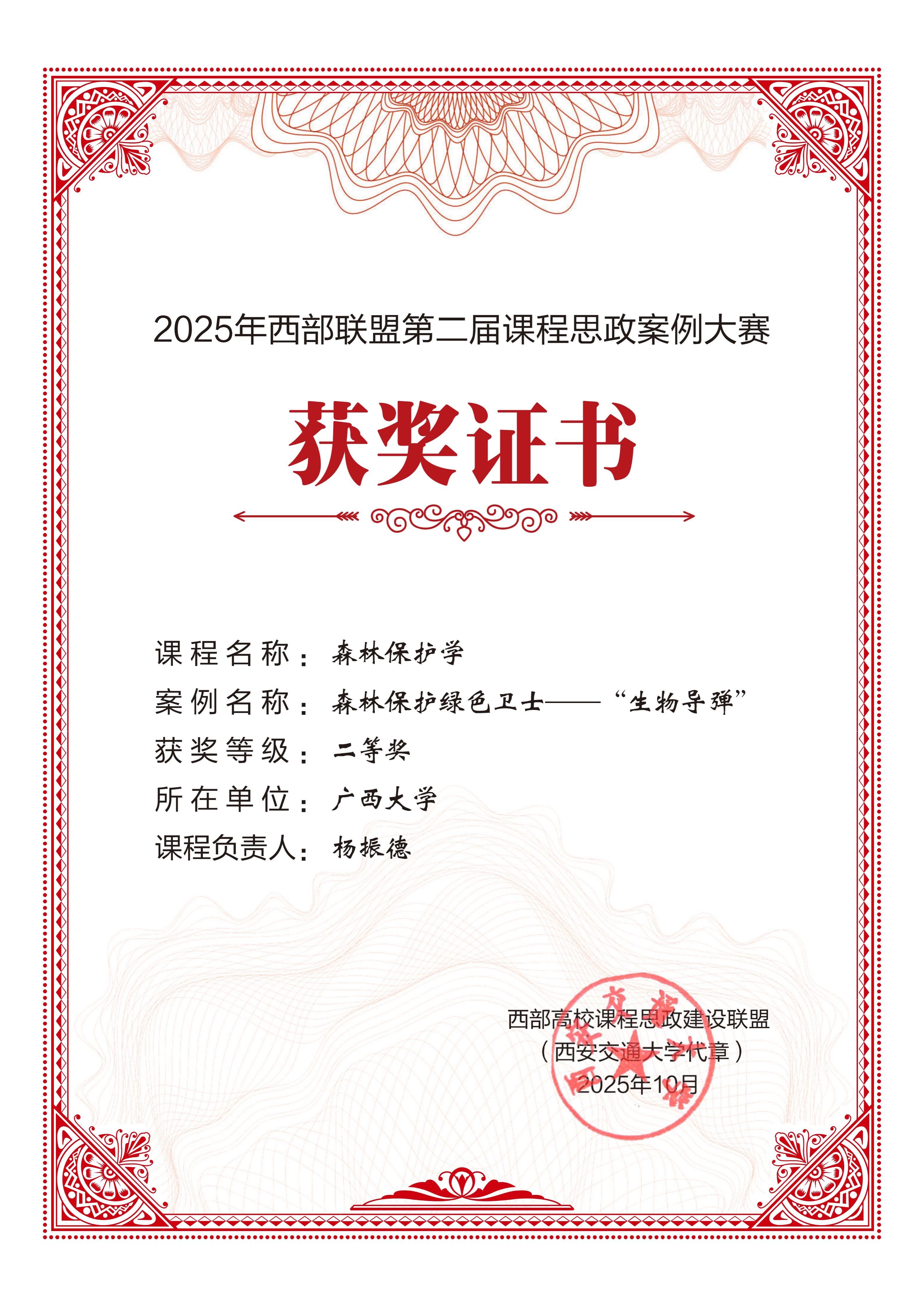 此次获奖案例以“生物导弹”技术在广西森林病虫害防治中的应用为教学场景,将生态文明理念、林业工作者的创新精神与服务地方的责任担当等思政元素,融入专业知识讲授,实现了价值引领与地方人才培养需求的深度契合,为同类课程提供了良好范例。